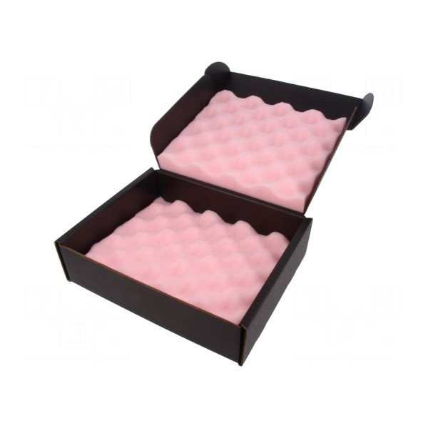 Pudełko antystatyczne ESD wykonane z tektury o właściwościach przewodzących. Wewnątrz znajduje się pianka ochronna, która zabezpiecza przechowywane komponenty przed uszkodzeniami mechanicznymi oraz wyładowaniami elektrostatycznymi.