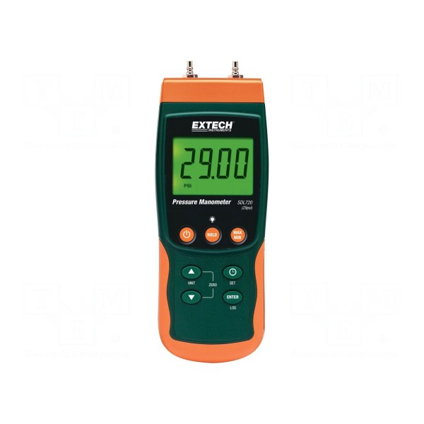 Rejestrator danych EXTECH SDL720 służy do pomiaru różnicy ciśnień w zakresie od 1 do 2000mbar z dokładnością ±2% i rozdzielczością 1mbar. Urządzenie obsługuje szeroki wachlarz jednostek pomiarowych, w tym mbar, atm, hPa, inHg, inH2O, kg/cm², kPa, mH2O, mmHg oraz psi. Dane rejestrowane są z częstotliwością próbkowania ustawianą w przedziale od 1s do 9h.