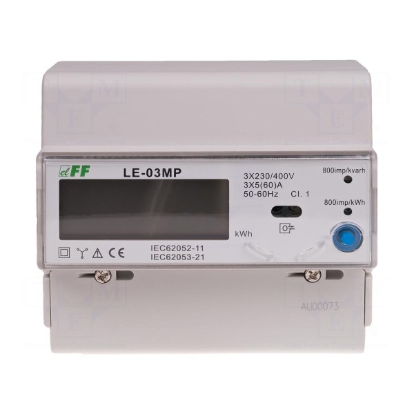 Licznik energii elektrycznej LE-03MP to cyfrowe urządzenie montażowe przeznaczone do pracy w sieciach 3-fazowych 4-przewodowych. Urządzenie umożliwia bezpośredni pomiar energii czynnej i biernej, a także monitorowanie napięcia AC, prądu AC oraz współczynnika mocy. Znamionowy prąd pracy wynosi 5A, natomiast prąd maksymalny osiąga wartość 60A przy częstotliwości 50Hz.