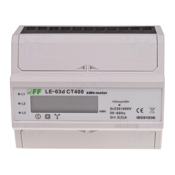 Licznik energii elektrycznej LE03D-CT400 to cyfrowe urządzenie przeznaczone do pomiaru energii czynnej w sieciach 3-fazowych 4-przewodowych. Miernik wykorzystuje pośredni sposób pomiaru z użyciem przekładnika prądowego 5A, przy prądzie znamionowym 1,5A oraz prądzie maksymalnym 5A. Urządzenie dostosowane jest do pracy przy napięciu znamionowym 0,23kV oraz 0,4kV i charakteryzuje się klasą dokładności 1.