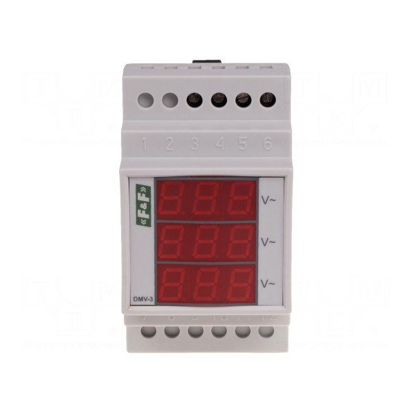 Woltomierz DMV-3RMS to cyfrowe urządzenie montażowe przeznaczone do pracy w sieciach 3-fazowych. Miernik realizuje pomiar rzeczywistej wartości skutecznej napięcia AC, korzystając z technologii True RMS. Urządzenie obsługuje zakres pomiarowy od 100V do 265V przy częstotliwości pracy mieszczącej się w przedziale 45–55Hz.