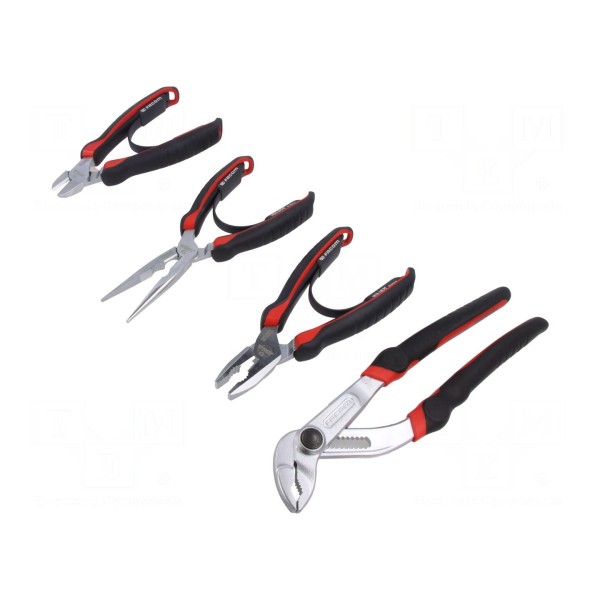 Zestaw narzędzi zawiera cztery rodzaje szczypiec przeznaczonych do zróżnicowanych prac montażowych i serwisowych. W skład kompletu wchodzą szczypce typu uniwersalnego, przeznaczone do chwytania i gięcia przedmiotów oraz narzędzia przystosowane do cięcia.