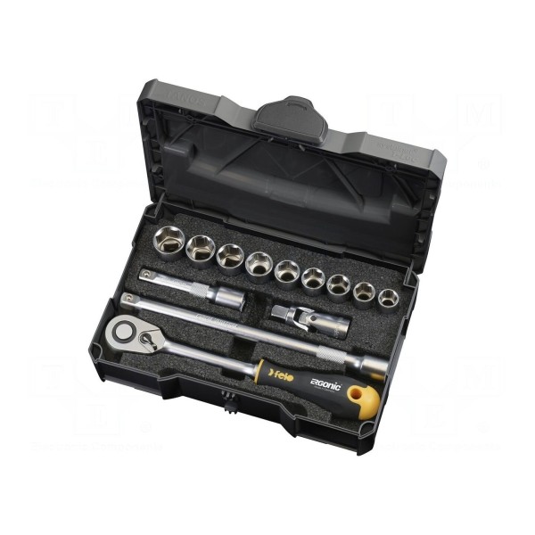 Zestaw zawiera narzędzia nasadowe 6-kątne oparte na napędzie 1/2". Komplet składa się z 13 elementów, zapewniając konfigurację niezbędną do prac montażowych oraz obsługi połączeń śrubowych.