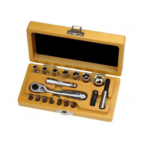 W zestawie: adapter, grzechotka 1/4", końcówki wkrętakowe 1/4" (C6,3), nasadki 6-kątne 1/4" oraz przedłużacz 1/4" o długości 50mm.