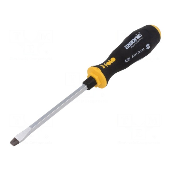 Wkrętak do pobijania FELO 450 055 40 wyposażony jest w płaski grot o rozmiarze 5,5x1mm. Konstrukcja narzędzia przystosowana jest do prac wymagających użycia siły uderzeniowej bezpośrednio na trzon wkrętaka.