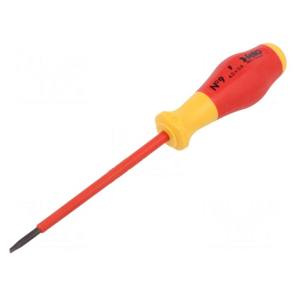 Wkrętak typu izolowanego wyposażony w grot płaski o rozmiarze 4x0,8mm. Konstrukcja narzędzia zapewnia izolację wymaganą przy pracy pod napięciem.