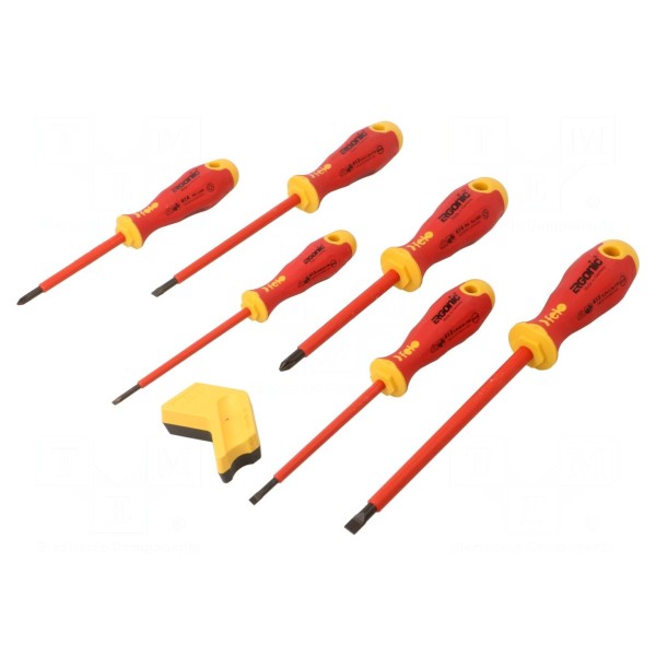 Zestaw zawiera sześć wkrętaków izolowanych, w skład których wchodzą końcówki typu Phillips oraz płaskie. Dostępne rozmiary grotów obejmują PH1, PH2 oraz płaskie SL 3, SL 4, SL 5,5 i SL 6,5, co pozwala na wszechstronne zastosowanie w pracach montażowych i serwisowych.