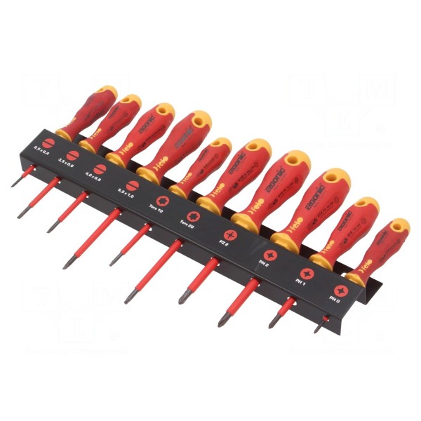 Zestaw zawiera 10 izolowanych wkrętaków, które są przystosowane do pracy pod napięciem do 1kV AC. W skład kompletu wchodzą narzędzia z grotami typu Phillips, płaskimi, Pozidriv oraz Torx. Dostępne rozmiary obejmują PH0, PH1, PH2, PZ2, TX10, TX20 oraz wkrętaki płaskie o wymiarach 2,5x0,4mm, 3,5x0,6mm, 4x0,8mm i 5,5x1mm.