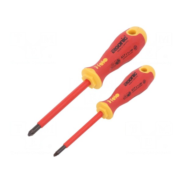 Zestaw zawiera dwa wkrętaki izolowane z grotem typu PlusMinus PZ, przeznaczone do prac przy instalacjach elektrycznych pod napięciem do 1kV AC. Narzędzia wyposażone są w groty w rozmiarach PZ/S1 oraz PZ/S2, co pozwala na obsługę zróżnicowanych elementów montażowych w osprzęcie elektroinstalacyjnym.