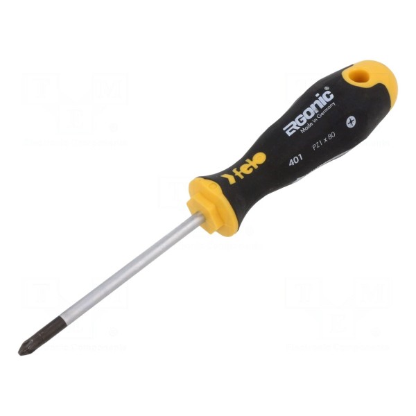 Wkrętak standardowy FELO 401 102 10 został wyposażony w grot typu Pozidriv o rozmiarze PZ1. Produkt jest przeznaczony do pracy ze śrubami z gniazdem typu PZ, zapewniając dopasowanie do standardowych elementów złącznych tego typu.