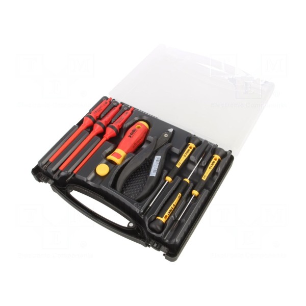 Zestaw składa się z 9 izolowanych elementów przeznaczonych do prac montażowych. W skład pakietu wchodzą różnorodne końcówki wkrętakowe, rękojeść wkrętakowa oraz wkrętaki precyzyjne.