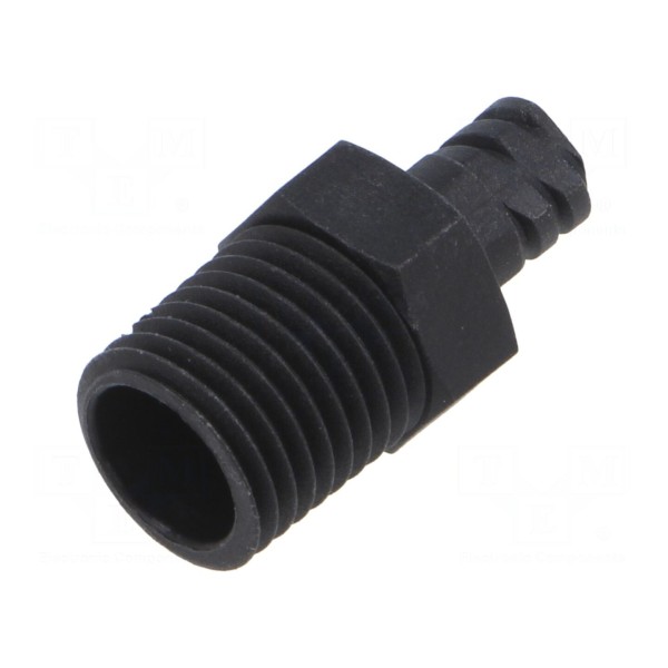 Złącze zostało wyposażone w gwint typu NPT 1/4". Komponent znajduje zastosowanie w procesach dozowania substancji chemicznych przy użyciu urządzeń dozujących.