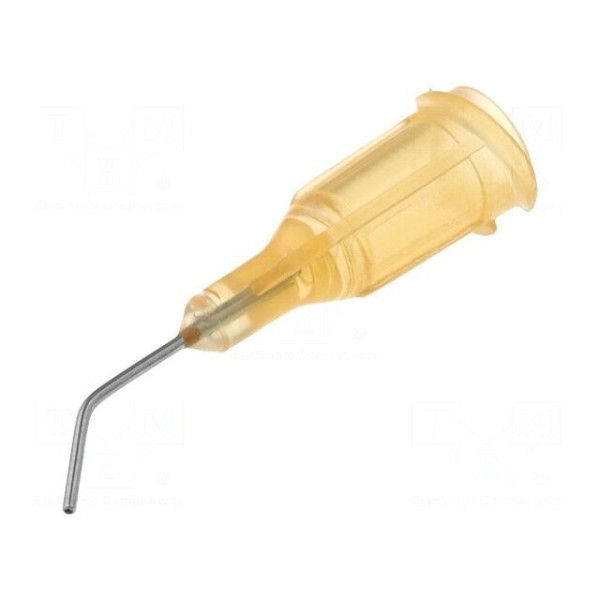Igła dozująca o rozmiarze 23 wyposażona jest w stalową końcówkę oraz korpus wykonany z polipropylenu w kolorze pomarańczowym. Element posiada zagięty kształt pod kątem 45°, co umożliwia precyzyjną aplikację w trudno dostępnych miejscach. Średnica wewnętrzna igły wynosi 0,33 mm, a jej długość to 0,5 cala.