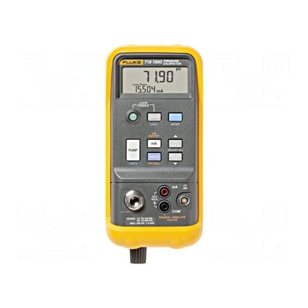 Kalibrator FLUKE 719-100G służy do precyzyjnego pomiaru ciśnienia w zakresie od –0,85 do 7 bar oraz prądu stałego w zakresie 0,001...24 mA. Urządzenie pozwala na jednoczesny pomiar obu tych wartości, co ułatwia diagnostykę systemów. Dopuszczalne nadciśnienie wynosi dwukrotność pełnego zakresu pomiarowego, a rozdzielczość pomiaru ciśnienia osiąga poziom 1 mbar.