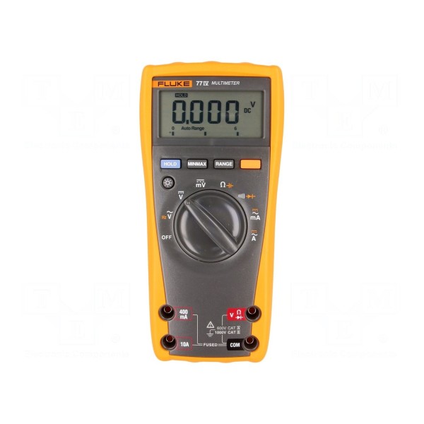 Multimetr cyfrowy FLUKE 77-IV to przyrząd pomiarowy wyposażony w wyświetlacz LCD o rozdzielczości 6000 z bargrafem 33-segmentowym aktualizowanym z częstotliwością 32 odczytów na sekundę. Urządzenie umożliwia pomiar napięcia DC w zakresie do 1kV, napięcia AC do 1kV, prądu DC i AC do 10A, rezystancji do 50MΩ, pojemności do 9,999mF oraz częstotliwości do 99,99kHz. Dokładność pomiaru napięcia DC wynosi ±(0,3% + 1 digit), natomiast dla napięcia AC oraz prądu AC parametr ten osiąga ±(2% + 2 digit).