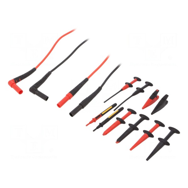 Zestaw składa się z czarnych i czerwonych przewodów pomiarowych, dostosowanych do wykonywania pomiarów elektrycznych. Wykorzystane akcesoria zapewniają odpowiednią konfigurację połączeń dla urządzeń pomiarowych.