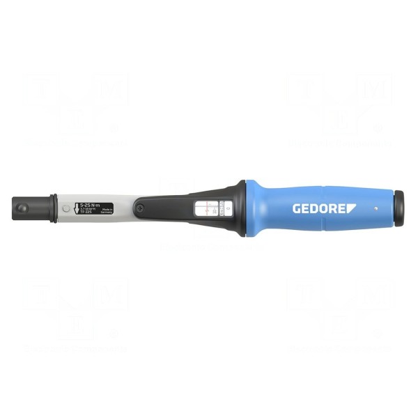 Klucz dynamometryczny marki GEDORE jest przeznaczony do kontrolowanego dokręcania połączeń śrubowych w zakresie momentu od 5 do 25 Nm. Urządzenie zostało wykonane ze stali i charakteryzuje się dokładnością wynoszącą 3%. Narzędzie posiada dwukierunkową konstrukcję oraz mocowanie typu kołek o rozmiarze gniazda 16 mm.