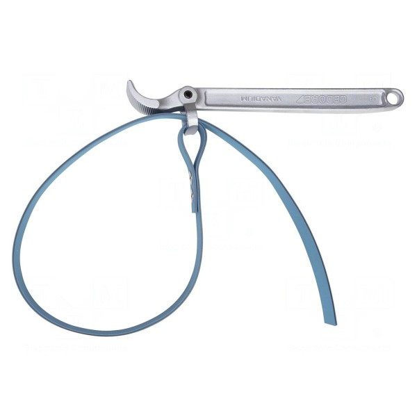 Klucz taśmowy został wykonany ze stali chromowo-wanadowej, co zapewnia wytrzymałość konstrukcji podczas pracy. Narzędzie posiada pokrycie chromowane, które chroni powierzchnię przed korozją.