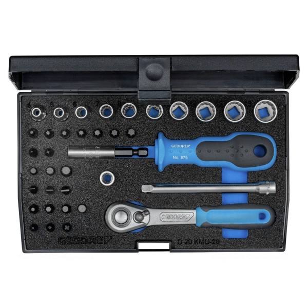 Zestaw kluczy nasadowych GEDORE 1822373 zawiera 37 elementów przeznaczonych do prac montażowych i serwisowych. W skład kompletu wchodzi grzechotka oraz zestaw nasadek współpracujących z gniazdem uchwytu o rozmiarze 1/4".