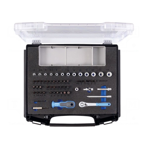 Zestaw narzędziowy typu klucz nasadowy zawiera 58 elementów przystosowanych do prac montażowych. W komplecie znajduje się grzechotka oraz szeroki wybór końcówek nasadowych o różnych kształtach.