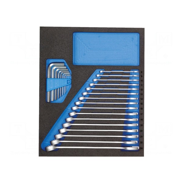 Zestaw kluczy imbusowych oraz płasko-oczkowych we wkładce piankowej