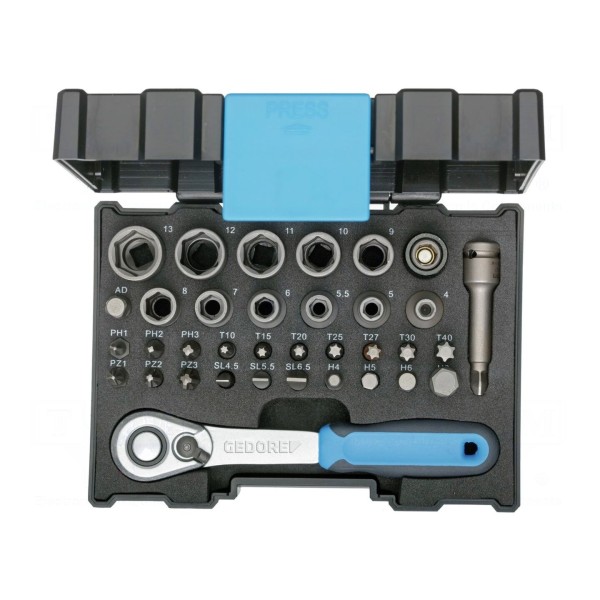 Zestaw narzędzi obejmuje 35 elementów zamkniętych w pudełku, zaprojektowanych do prac z różnymi typami śrub. W skład kompletu wchodzą klucze nasadowe 6-kątne oraz grzechotka z gniazdem uchwytu w rozmiarze 1/4".