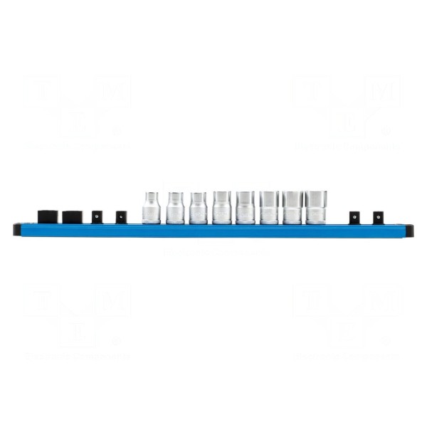 Zestaw zawiera 9 sztuk kluczy nasadowych 6-kątnych przystosowanych do współpracy z uchwytem o rozmiarze 1/2". Narzędzia te przeznaczone są do prac montażowych wymagających użycia standardowych profili nasadowych.