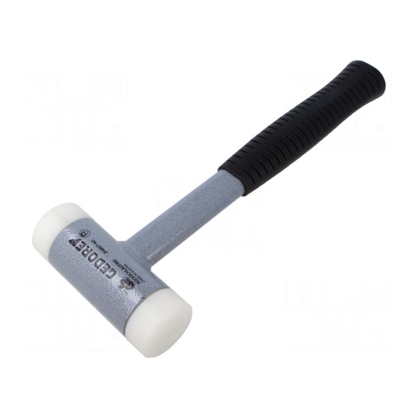 Młotek montażowy i warsztatowy wyposażony w okrągłe końcówki o średnicy 40 mm wykonane z poliamidu. Zastosowany materiał końcówki charakteryzuje się wysoką twardością, co umożliwia przekazywanie energii uderzenia w sposób kontrolowany. Konstrukcja narzędzia jest bezodrzutowa, co wpływa na stabilność pracy podczas uderzeń.