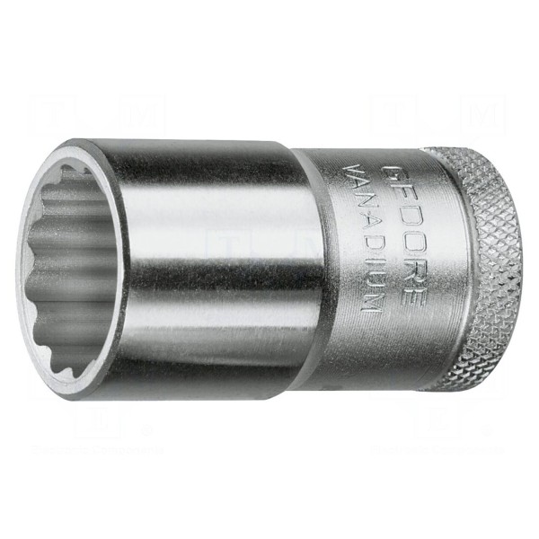 Nasadka 12-kątna o rozmiarze gniazda 3/4" przeznaczona jest do współpracy z napędami wyposażonymi w uchwyt o rozmiarze 1/2". Narzędzie wykonano ze stali chromowo-wanadowej, a powierzchnia została zabezpieczona warstwą chromu.