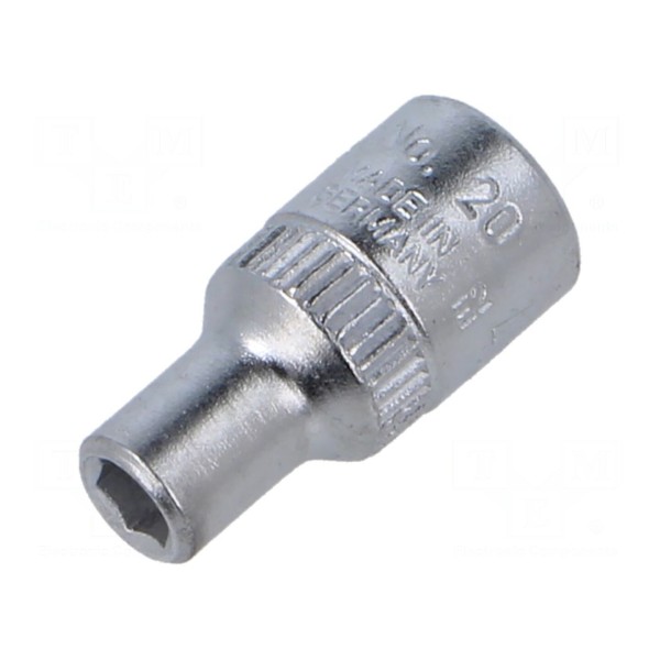Narzędzie zostało wykonane ze stali narzędziowej z wykończeniem chromowanym. Całkowita długość nasadki wynosi 25 mm.