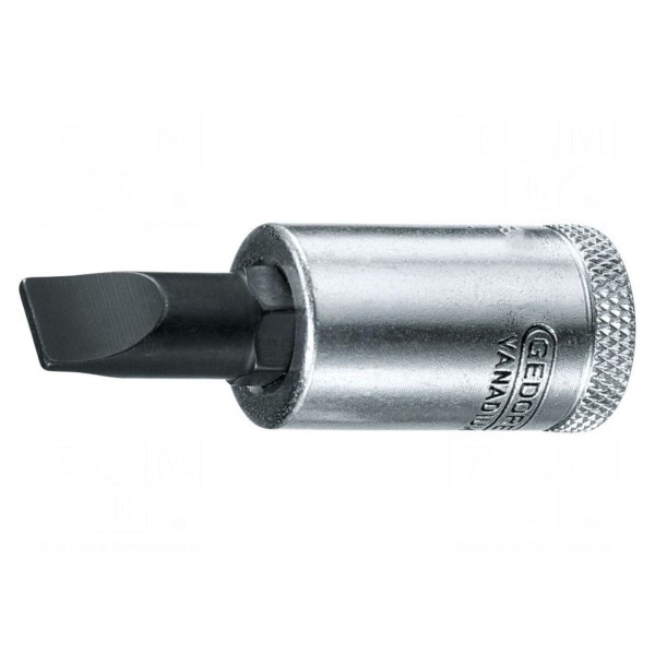 Nasadka z grotem płaskim o wymiarach 10x1,6 mm przystosowana jest do współpracy z pokrętłami wyposażonymi w zabierak 3/8". Element charakteryzuje się długością całkowitą wynoszącą 55 mm.