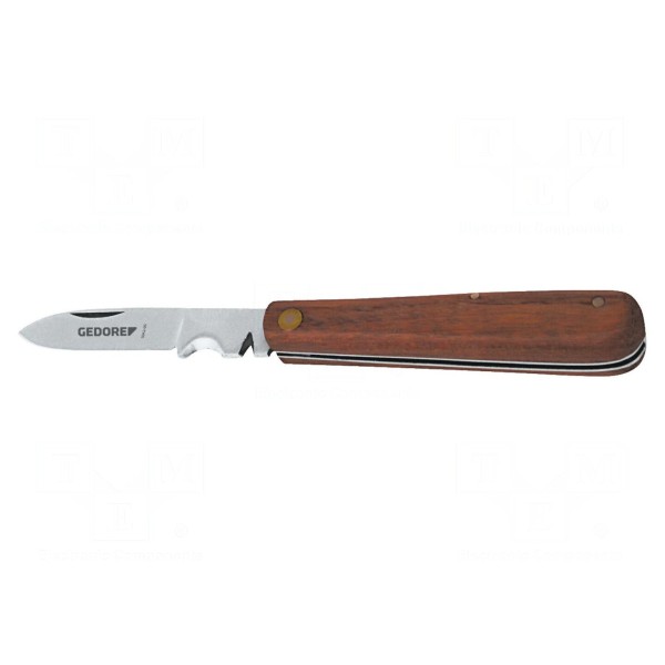 Narzędzie przeznaczone do ściągania izolacji z przewodów elektrycznych. Nóż posiada składaną konstrukcję, co ułatwia jego przechowywanie i zwiększa bezpieczeństwo podczas przenoszenia.