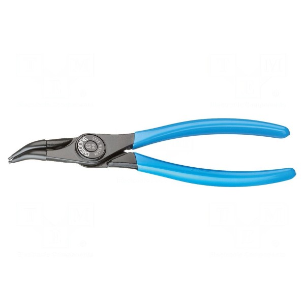 Narzędzie przeznaczone do obsługi wewnętrznych pierścieni osadczych o średnicy w zakresie od 19 do 60mm. Konstrukcja szczypiec w wersji kątowej z główką odgiętą pod kątem 45° ułatwia pracę w ograniczonych przestrzeniach roboczych.
