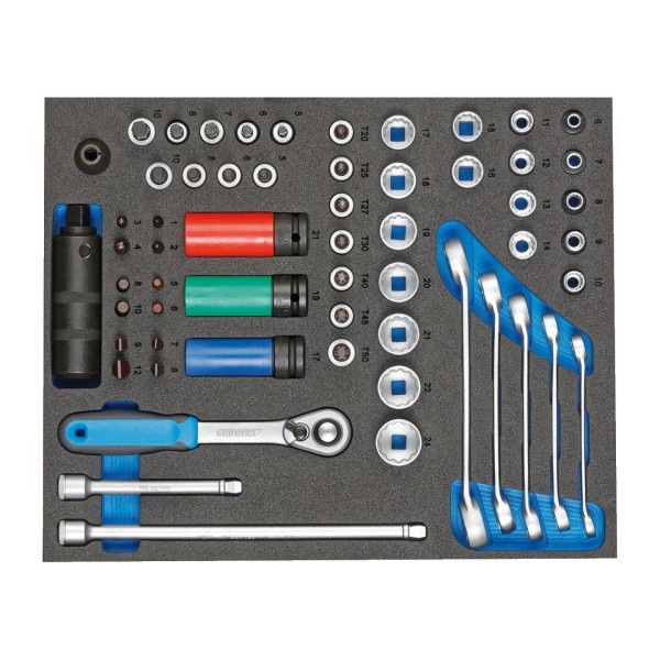 Zestaw narzędzi obejmuje klucze z grzechotką, klucze nasadowe oraz klucze oczkowe. Komplet został umieszczony na wkładce z pianki, która umożliwia uporządkowane przechowywanie elementów.
