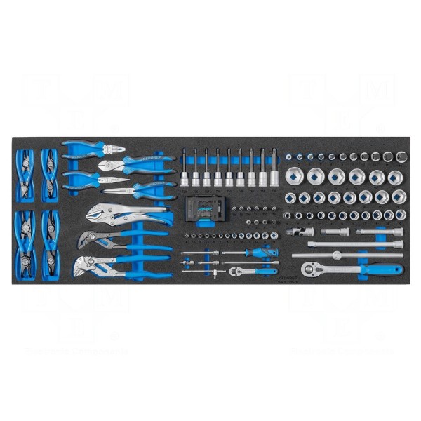 Całość kompletu dostarczana jest we wkładce piankowej, która ułatwia utrzymanie porządku w warsztacie oraz zapewnia organizację narzędzi w szufladach lub skrzyniach narzędziowych.