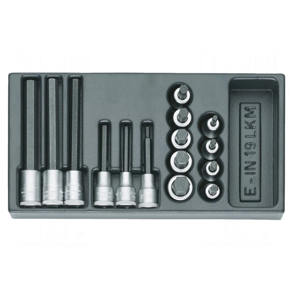 Zestaw zawiera końcówki nasadowe z grotem typu imbus, przeznaczone do pracy z uchwytami o rozmiarze gniazda 1/2". Komplet narzędzi został zaprojektowany z myślą o przechowywaniu i organizacji wewnątrz wózków warsztatowych.