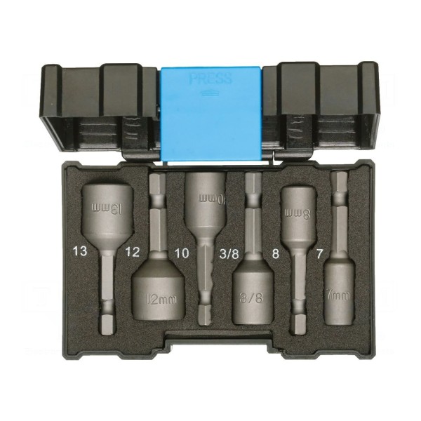 Zestaw zawiera sześciokątne końcówki nasadowe typu maszynowego przeznaczone do prac wkrętakowych. Komplet składa się z sześciu elementów o różnych rozmiarach metrycznych: 7 mm, 8 mm, 10 mm, 12 mm oraz 13 mm, a także jednego rozmiaru w calach HEX 3/8".