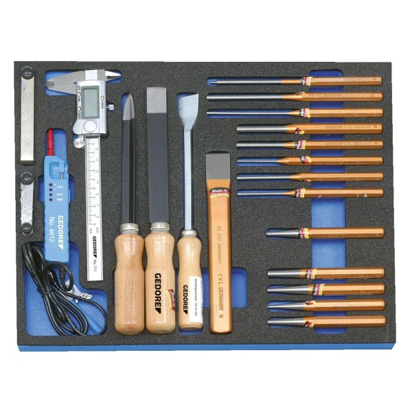 Zestaw narzędzi ogólnego stosowania zawiera 21 elementów przeznaczonych do prac warsztatowych. W skład wyposażenia wchodzą przecinaki, wybijaki oraz suwmiarka.