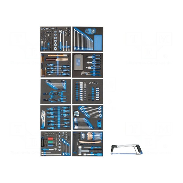 Zestaw narzędzi ogólnego stosowania zawiera 308 elementów przeznaczonych do wyposażenia wózka warsztatowego. Komplet został zaprojektowany z myślą o różnorodnych pracach montażowych i serwisowych wymagających dostępu do szerokiego spektrum narzędzi ręcznych.