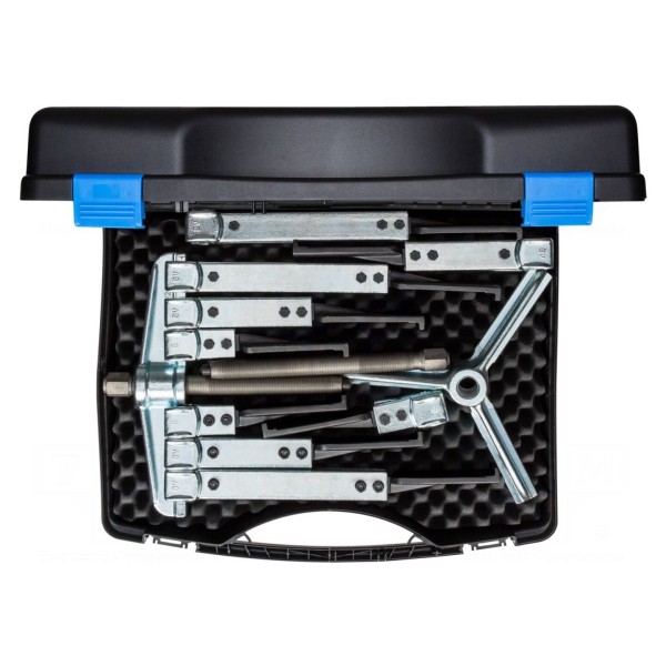 Zestaw narzędzi typu ściągacz do łożysk umożliwia demontaż elementów osadzonych na wałach. Wersja ta oferuje możliwość konfiguracji jako ściągacz dwuramienny lub trójramienny, co pozwala na dopasowanie narzędzia do specyfiki demontowanego elementu.