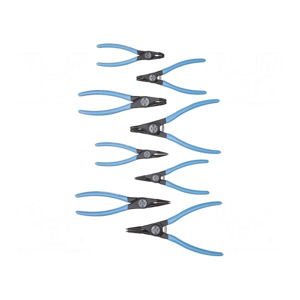 Zestaw zawiera osiem sztuk szczypiec przeznaczonych do pracy z pierścieniami osadczymi. Narzędzia te są zaprojektowane do montażu i demontażu zabezpieczeń typu Segera w elementach maszyn i urządzeń.
