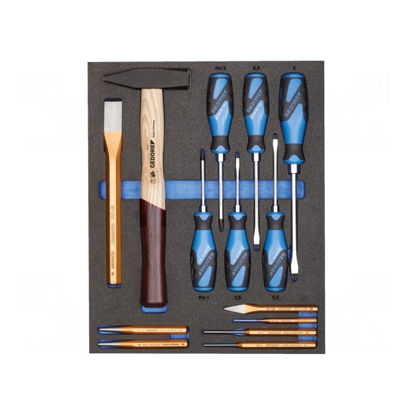 Zestaw narzędzi obejmuje wkrętaki, dłuto oraz młotek, które zostały rozmieszczone na wkładce wykonanej z pianki. Wymiary wkładki wynoszą 390x316,5 mm, co pozwala na jej dopasowanie do wyposażenia wózków warsztatowych.