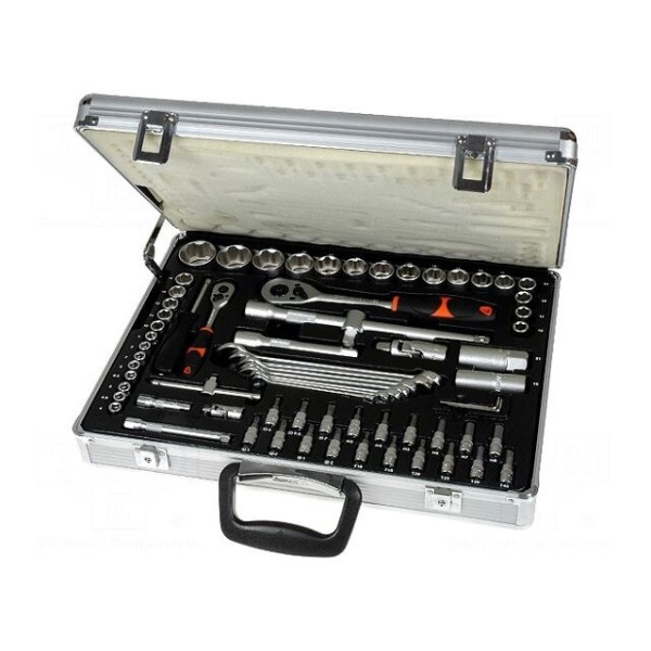 Całość przechowywana jest w walizce, która została wyposażona w dwa zamki z kluczami, co ułatwia organizację i transport narzędzi. Kompletny zestaw zapewnia szerokie możliwości montażowe dzięki bogatej selekcji nasadek i akcesoriów pomocniczych.