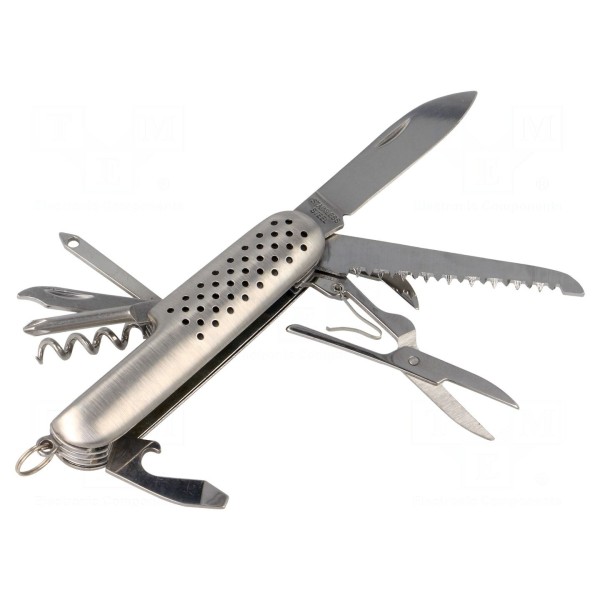 Wielofunkcyjny charakter narzędzia wynika z bogatego wyposażenia dodatkowego, które obejmuje korkociąg, nożyce, piłę do drewna oraz pilnik do paznokci. Użytkownik ma również do dyspozycji otwieracz do konserw oraz otwieracz do kapsli zintegrowany z końcówką wkrętakową, a także dedykowane ostrze do przewlekania.