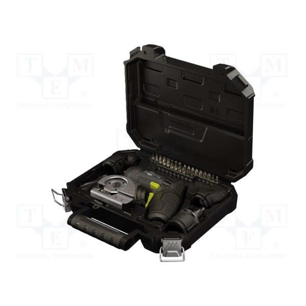 Całość zestawu dostarczana jest w skrzynce narzędziowej ułatwiającej przechowywanie i organizację. W zestawie znajduje się 35 elementów, w tym adapter, komplet końcówek wkrętakowych oraz przewód USB A – USB C służący do ładowania urządzenia.