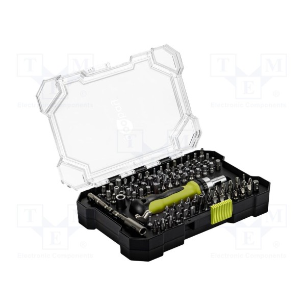 Zestaw zawiera 100 sztuk końcówek wkrętakowych o zróżnicowanych typach grotów, takich jak imbus, kwadrat, Phillips, płaski, Pozidriv, Torx, Torx z zabezpieczeniem oraz Tri-Wing. W zestawie: uchwyt wkrętakowy.