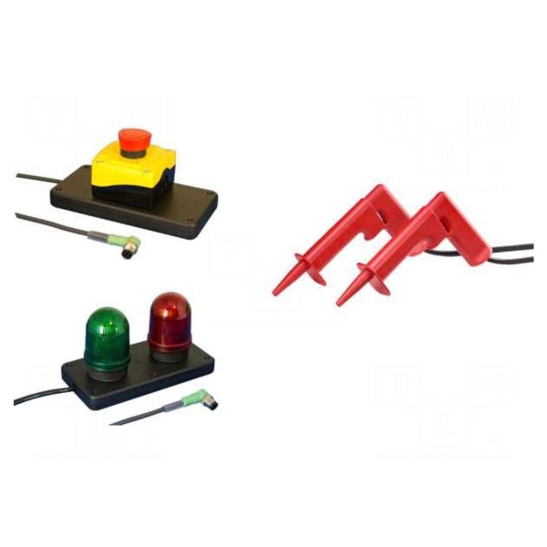 W zestawie: przycisk, dwie sondy pomiarowe oraz sygnalizator świetlny. Całość dostarczana jest jako zintegrowany pakiet komponentów.