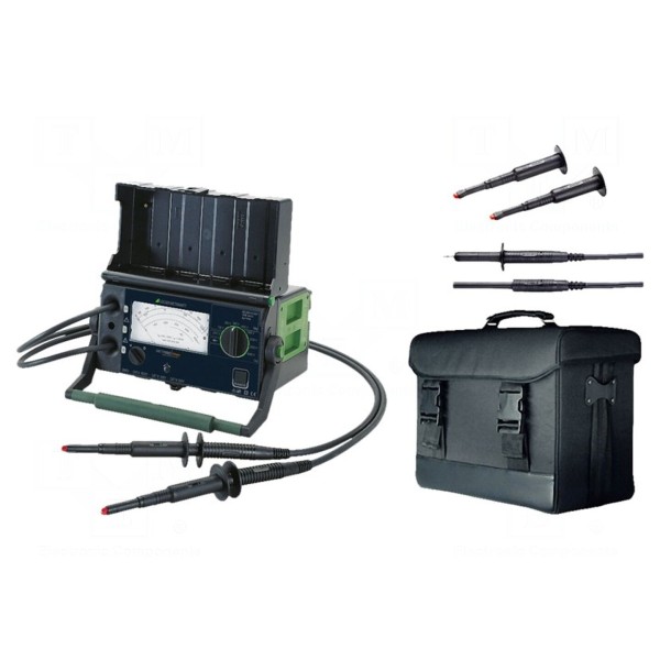 Miernik rezystancji izolacji GOSSEN METRAWATT M551T to analogowy przyrząd pomiarowy przeznaczony do weryfikacji parametrów izolacji oraz pomiarów napięcia stałego i przemiennego w zakresie do 2kV. Urządzenie umożliwia wybór napięcia pomiarowego w szerokim spektrum wartości: 100V, 250V, 500V, 1kV, 1,5kV, 2kV, 2,5kV oraz 5kV. Pomiar rezystancji izolacji realizowany jest w zakresie od 100kΩ do 1TΩ, przy czym dokładność pomiaru napięć DC i AC wynosi ±5%.
