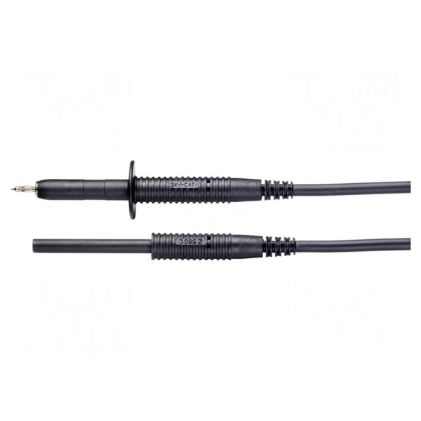 Przewód pomiarowy charakteryzuje się wykonaniem izolacji z tworzywa sztucznego PVC, które zapewnia elastyczność i odporność podczas wykonywania prac pomiarowych. Całkowita długość przewodu wynosi 1,65m.