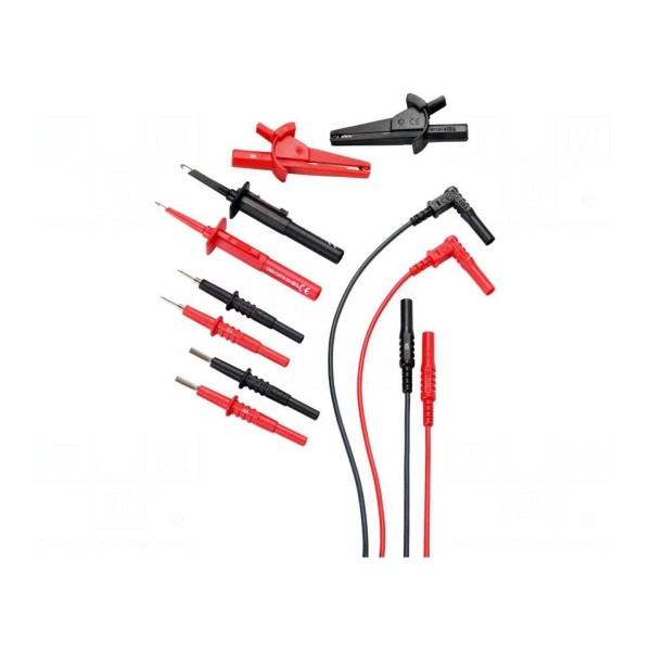 Akcesoria zapewniają bezpieczeństwo użytkowania potwierdzone zgodnością z normami CAT III 1000V oraz CAT IV 600V. Przewody dostępne są w kolorze czarnym oraz czerwonym. W zestawie: chwytaki pomiarowe x2, przewody pomiarowe x2, sonda do gniazd sieciowych USA, sondy pomiarowe x2, zacisk krokodylkowy x2.